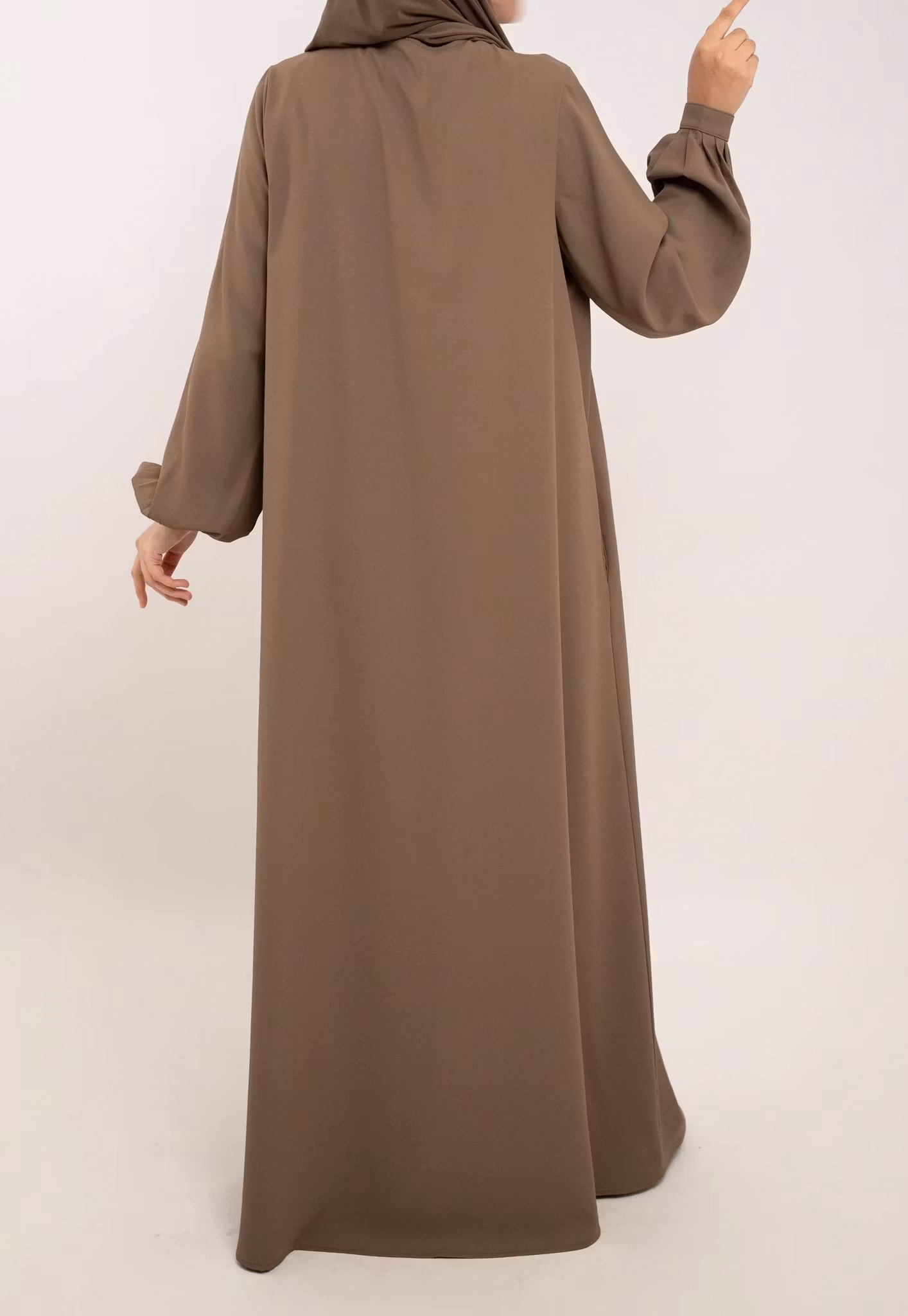 En stilren abaya i populärt Jazz-tyg, känt för sin mjuka känsla, sitt vackra fall och sin naturligt lätt skrynkliga struktur som gör att plagget nästan inte behöver strykas.