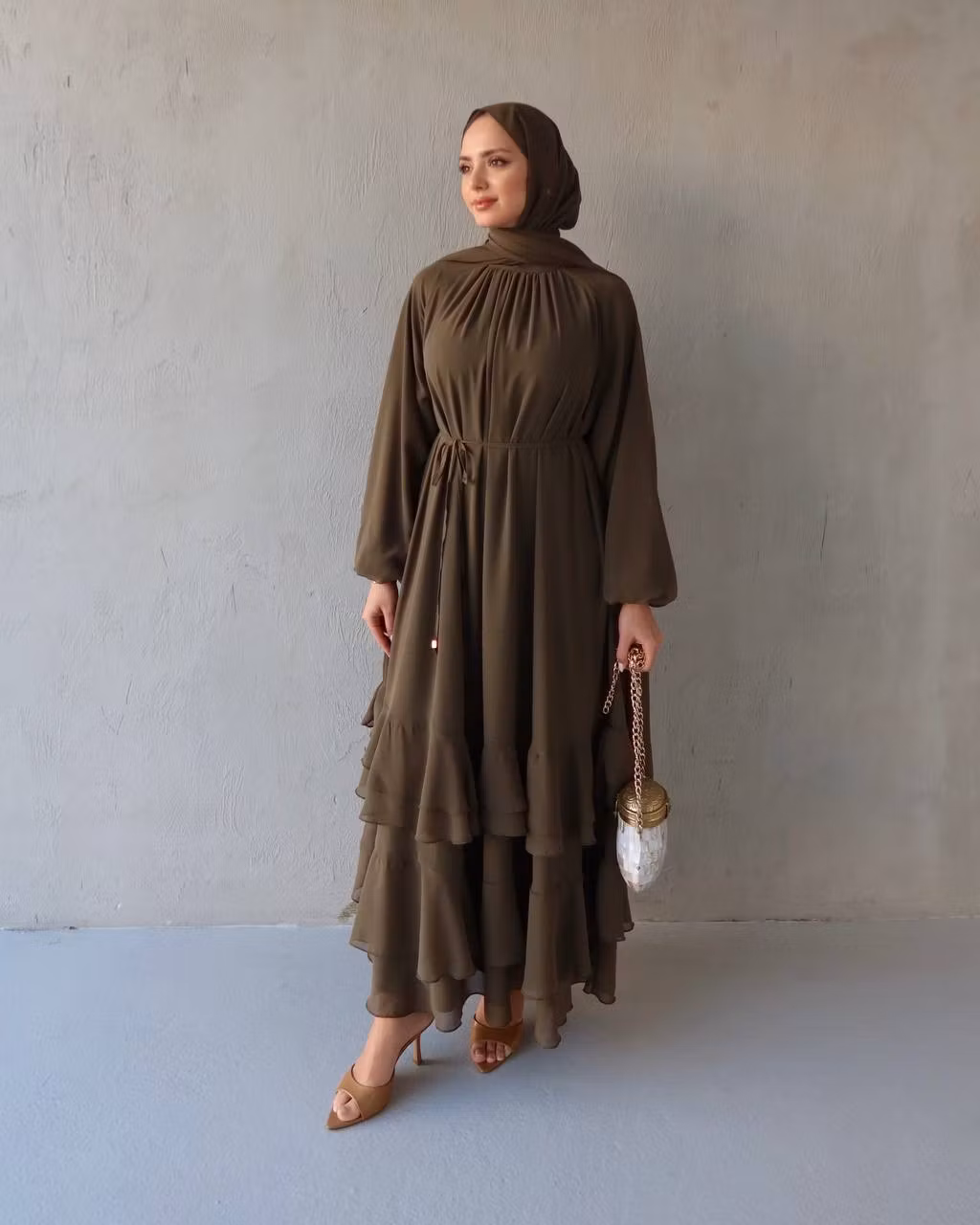 Elegant Chiffon AbayaEn vacker och feminin abaya i lyxig chiffon som kombinerar elegans och rörelse. Designen har en mjukt rynkad halsringning och ett knytbälte