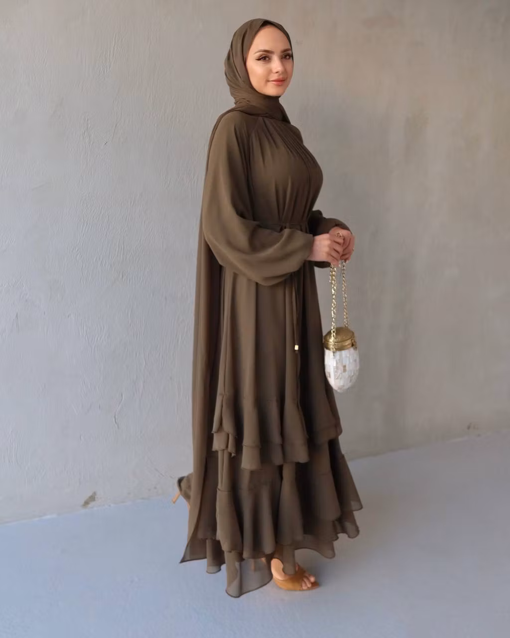 Den nedre delen av abayan är designad med lager av chiffon-volanger som ger plagget ett exklusivt fall och en vacker rörelse när man går. Det lätta chiffontyget gör abayan både luftig och bekväm, perfekt för festliga tillfällen.