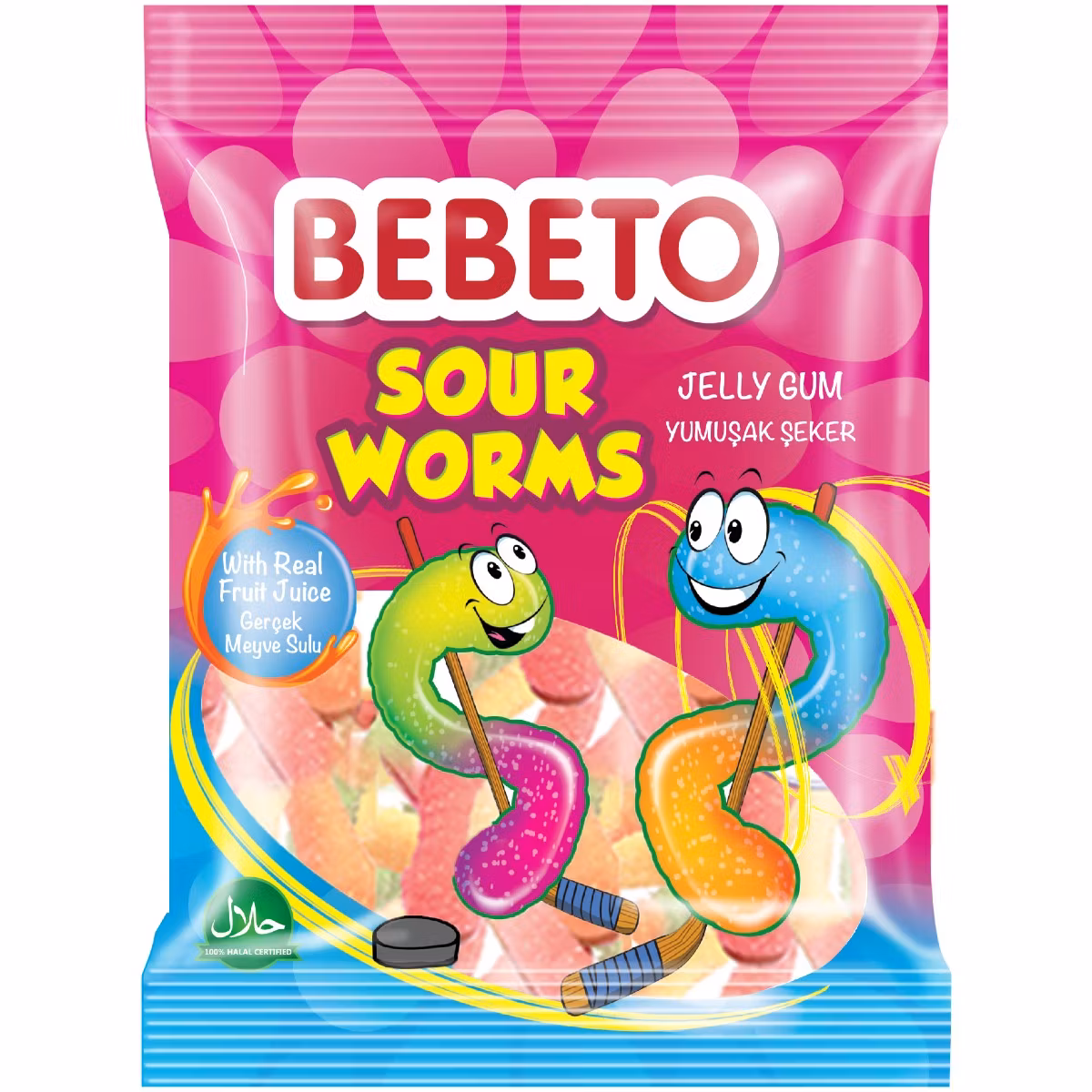 Bebeto Sour Worms 80gSurt gelégodis med fruktsmak 80gIngredienser: Glukossirap, Socker, Äppeljuice från koncentrat, Modifierad majsstärkelse, Oxgelatin, Surhets